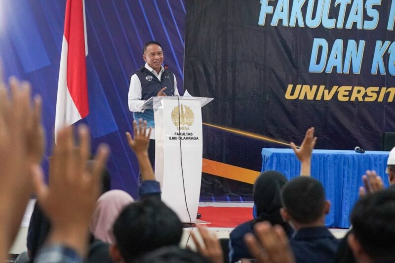 Surabaya: Menteri Pemuda dan Olahraga Republik Indonesia (Menpora RI) Prof Dr Zainudin Amali, S.E., M.Si memberikan kuliah tatap muka langsung di hadapan Mahasiswa Fakultas Ilmu Keolahragaan dan Kesehatan (FIKK) Universitas Negeri Surabaya (Unesa). Kegiatan perkuliahan yang diikuti oleh para Mahasiswa Program Studi Keolahragaan ini dilaksanakan di Gedung U1 FIKK Unesa, Surabaya, Jawa Timur, Selasa (7/2) pagi.