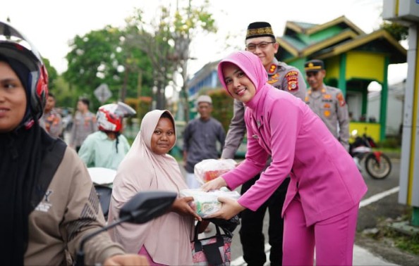 Tampak Kapolres Pidie AKBP Jaka Mulyana, SIK, MIK, didampingi Ketua Bhayangkari Cabang Pidie Ny. Ruri Jaka, serta para pejabat utama dan anggota Polres Pidie turun langsung ke jalan menyapa para pengguna jalan, baik pengendara roda dua maupun roda empat, serta membagikan paket takjil secara gratis.