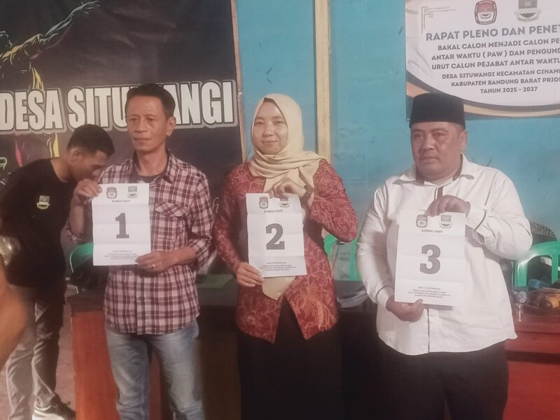 KBB – Situwangi, Liputan 1.net |13/4/24 Panitia Pemilihan Kepala Desa Pengganti Antar Waktu (PAW) Desa Situwangi, Kecamatan Cihampelas, Kabupaten Bandung Barat, resmi menetapkan tiga bakal calon menjadi Calon Kepala Desa PAW. Penetapan tersebut dilakukan melalui rapat pleno yang digelar di Gedung Serbaguna Desa Situwangi pada Minggu pagi.