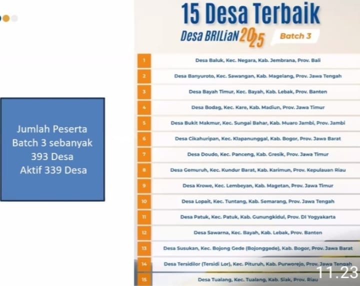 Program BRI Desa BRILiaN tahun 2025 Batch 3 ini merupakan inisiatif PT Bank Rakyat Indonesia (BRI) yang bertujuan untuk mendorong transformasi desa menuju kemandirian ekonomi berbasis potensi lokal, inovasi digital, dan pemberdayaan masyarakat.