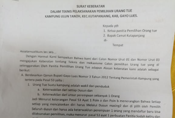 Surat keberatan bertanggal 28 Oktober 2025 yang dikirim ke liputan 1, Sabtu (1/11)/2025), itu ditujukan kepada Ketua Panitia Pemilihan Urang Tue dan Camat Kutapanjang. Keberatan disampaikan oleh Hasanuddin (Nomor Urut 01) dan Said Ali (Nomor Urut 03), bersama 16 perwakilan masyarakat lainnya.