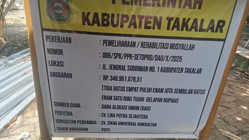 Takalar – liputan1.net | Sejumlah pekerja proyek rehabilitasi musallah di Jl. Jendral Sudirman No. 1, Kabupaten Takalar, terpantau tidak menggunakan alat keselamatan kerja (APD) saat kegiatan berlangsung. Proyek yang bersumber dari Dana Alokasi Umum (DAU) dengan nilai anggaran Rp 346.961.078,51, dikerjakan oleh CV. Lira Putra Sejahtera dan diawasi oleh CV. Zikra Universal Konsultan ini menuai sorotan dari masyarakat setempat.