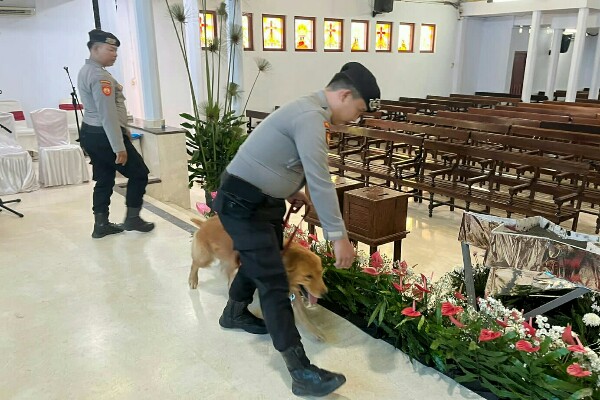Personel Ditsamapta bersama satwa terlatih yang memiliki kemampuan deteksi bahan peledak (handak), melakukan sterilisasi di lingkungan sekitar gereja, baik di dalam gereja maupun di halaman gereja yang akan menjadi tempat misa malam Natal.