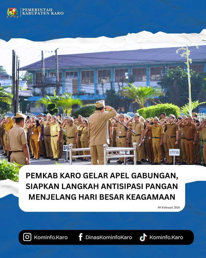 Liputan 1 Net. Kabanjahe,Karo – Bupati Karo, Brigjen Pol (Purn) Dr. dr. Antonius Ginting, Sp.OG., M.Kes, yang diwakili oleh Wakil Bupati Karo, Komando Tarigan, SP., bertindak sebagai pimpinan apel pada Apel Gabungan yang dilaksanakan di halaman Kantor Bupati Karo, pada Senin (09/02/2026).