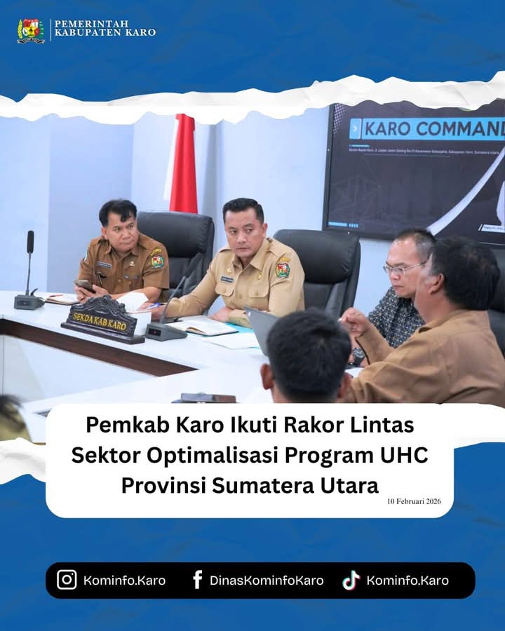 Liputan 1 Net.|  Kab Karo. – Bupati Karo, Brigjen Pol (Purn) Dr. dr. Antonius Ginting, Sp.OG., M.Kes., yang diwakili oleh Sekretaris Daerah Kabupaten Karo, Gelora Kurnia Putra Ginting, S.STP, M.M., menghadiri Rapat Koordinasi Lintas Sektor terkait Pelaksanaan Program Universal Health Coverage (UHC) Provinsi Sumatera Utara yang dilaksanakan secara daring melalui Zoom Meeting, bertempat di Ruang KCC Kantor Bupati Karo, pada Selasa (10/02/2026).