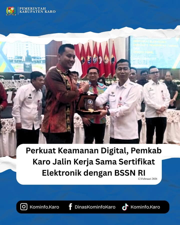 Liputan 1 Net. | DEPOK – Pemerintah Kabupaten Karo secara resmi menjalin kerja sama strategis dengan Badan Siber dan Sandi Negara (BSSN) RI terkait pemanfaatan Sertifikat Elektronik. Komitmen ini dikukuhkan melalui penandatanganan Perjanjian Kerja Sama (PKS) yang berlangsung di Gedung BSSN, Depok, Jawa Barat, Kamis (12/2/2026).