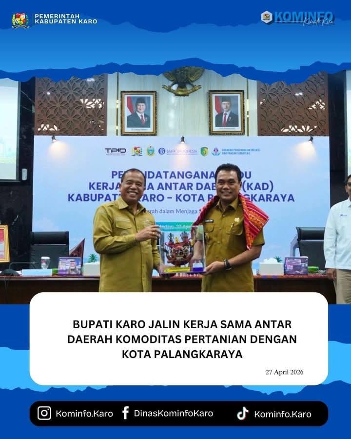 Medan,Sumut_Pemerintah Kabupaten Karo resmi menjalin kerja sama antar daerah dengan Pemerintah Kota Palangkaraya, untuk pengembangan dan pendistribusian komoditas hasil pertanian. Kegiatan ini dilaksanakan di Kantor Perwakilan Bank Indonesia Provinsi Sumatera Utara, Senin (27/4/2026).